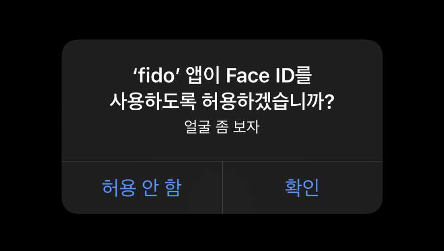 <?xml version="1.0" encoding="UTF-8"?> <!DOCTYPE plist PUBLIC "-//Apple//DTD PLIST 1.0//EN" "http://www.apple.com/DTDs/PropertyList-1.0.dtd"> <plist version="1.0"> <dict> .... <key>NSFaceIDUsageDescription</key> <string>얼굴 좀 보자</string> </dict> </plist>다시 실행해 보면...!