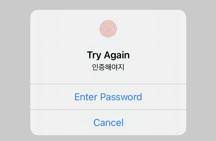 그런데 Non-matching 을 1회 시도하면 아래와 같이 Enter password 버튼이 노출되는데 인증정책이 deviceOwnerAuthenticationWithBiometrics 라면 버튼을 눌러도 실패로만 응답받게 되네요. password를 쓰고싶으면 정책을 deviceOwnerAuthentication로 설정하면 되겠습니다.